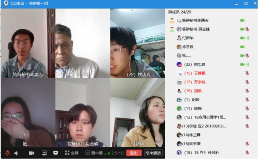 顺利进行,如期答辩。按照部署,答辩员工按群序号5人一小组依次答辩。答辩小组成员、答辩秘书进入QQ群视频通话,答辩人点击QQ群右上角的视频图标,加入视频通话,并打开摄像头。