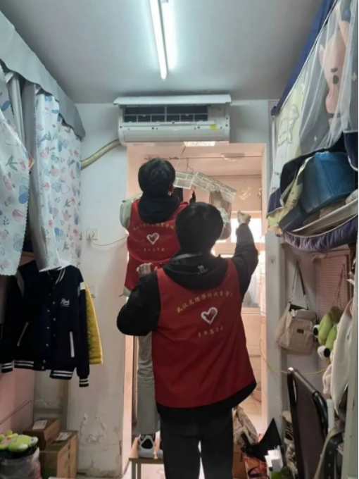 下午1时25分,志愿者们准时抵达15栋女生宿舍楼下,开始分发志愿者服装并进行了简短的动员讲话。负责人介绍了活动流程和注意事项,完成相关的培训过后,志愿者们开始分组协作。成员之间分工合作密切配合,其中一部分志愿者负责携带所需的清洗工具和材料,另一部分志愿者负责与寝室的居住人员沟通,剩下的志愿者则负责清洗空调空气过滤网。在分工合作的同时他们相互配合,使每个空调都得到彻底清洗和维护,确保清洗工作高效完成。每一个志愿者都尽心尽力,经过大家的共同努力,15栋女生寝室的空调滤网积灰被清理干净。