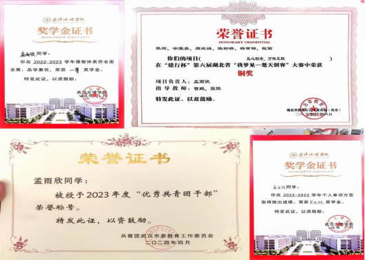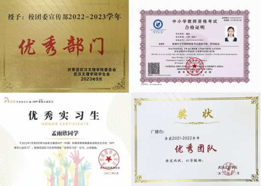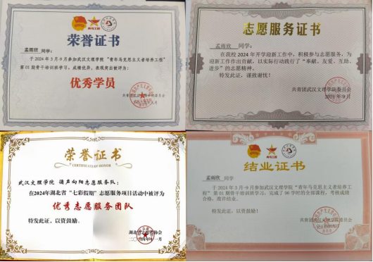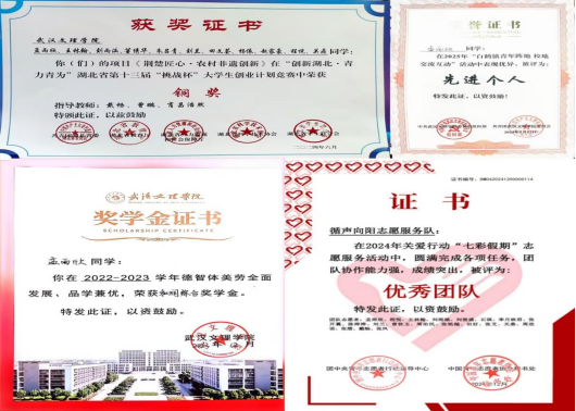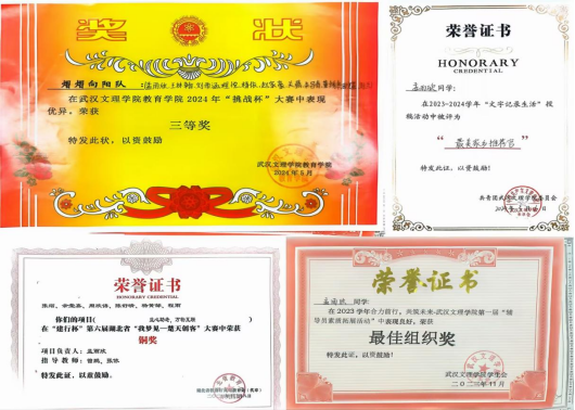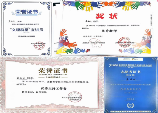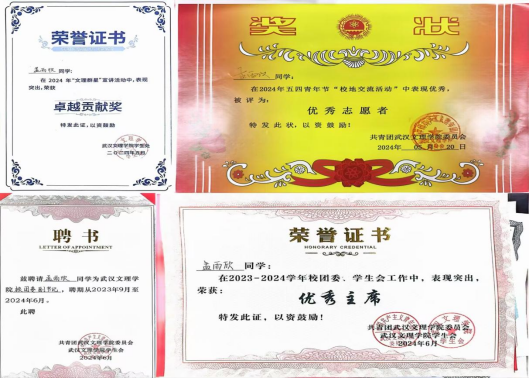 曾任校团委副书记、校广播台台长,负责青春武汉文理公众号、团团文理视频号等多平台,发文累计超716余篇,负责部门及广播台连续三年获优秀部门、优秀团队,现任21小教5班团支书、班长,综测成绩连续四年班级第一,获和润综合奖学金(全校仅5人),多次获市、校级优秀干部称号,在校期间,共获国家级、校级、院级荣誉40余项。主持世界杯冠军预测入口二十周年校庆庆典,作为唯一一名员工代表在校级教师节表彰大会发言。朗诵《雾重庆》入围CCTV朗诵比赛,广告作品获公司奖、入选国际展览、中国青年员工国防教育数字创意比赛湖北省三等奖。带领循声向阳志愿服务队参与2024暑期社会实践,获省级优秀团队,获校级优秀团队、优秀先进个人,带队参加房县青春阵地朗诵和五四文理群星先导片录制,作为第一批青马骨干班班班长,带领大家在理论与实践中学习体验,以97.2分成绩结业获优秀学员。投身支教和应急科普,参与全国APP公益实习,获全国优秀实习生,组织江岸区红领巾小小应急宣传员项目,为武汉市超20个社区,共计2000余人次服务,受邀成为江岸区首批安全宣推官,并将志愿服务经历凝聚为科技成果,获互联网+、挑战杯省级铜奖,个人经历受到人民网、学习强国多个平台报道。