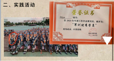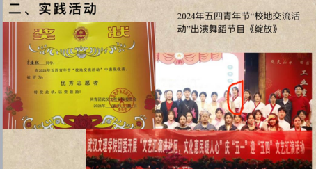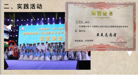 她的卓越表现不仅限于学习领域。在大一下学期,她参加了黄陂区群众文化节,荣获“最美志愿者”奖项,同时在文理群星表彰晚会上出演节目,展现了她的艺术才华。在军训中,她以出色的表现荣获军训优秀学员奖。