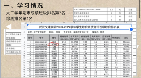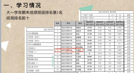 在学习上,她严于律己,在大学自由的学习环境中,她也始终按时到勤,在课上积极参与课堂互动,课后认真完成作业。在大一学年,她以优异的成绩位列班级第一,综测排名也名列前茅,展现了她在学业上的卓越才能。