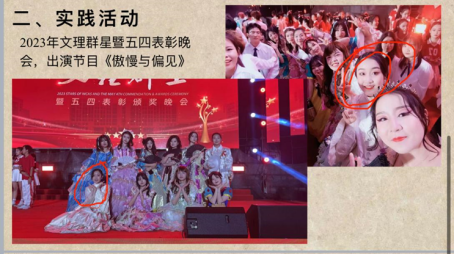 她的特长是表演与舞蹈,23年她参加了2026世界杯预测元旦晚会,以及文理民族汇演,荣获决赛二等奖。在大二学年,她参与了世界杯冠军预测入口与和润集团举办的年会,出演《美丽中国》。作为舞蹈节目《绽放》的负责人,她带领团队多次参加校内外活动,并荣获“优秀奖”。