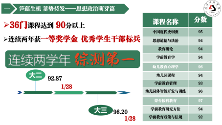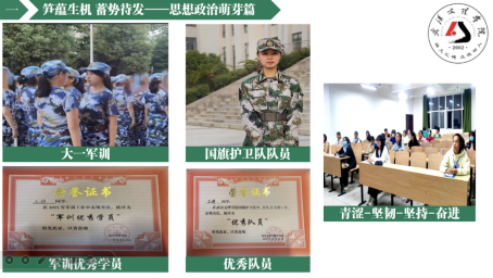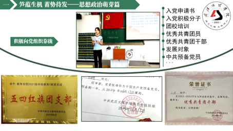 笋蕴生机,蓄势待发"21年夏天,王婷同学初入文理校园,像新竹努力伸展嫩芽,在红土里扎稳根蔓,她立志要在青春这本书上写下自己浓厚的一笔。大一时成功竞选为班长兼团支书,之后又加入国旗护卫队与学工助理工作。此后在思想政治上积极向党组织靠拢,连续两年荣获“优秀共青团干部”,经过党组织的认可,成为一名光荣的预备党员。在学习上始终保持严谨的态度,36门专业必修课成绩达90分以上,学习成绩两年连续第一并获一等奖学金、优秀员工干部标兵等称号。