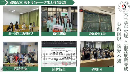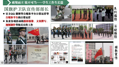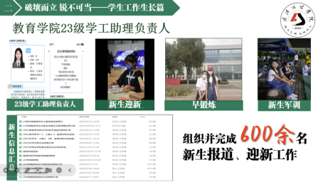 “破壤而立,锐不可当”王婷同学带领班级获得学风先进班集体、五四红旗团支部等荣誉。大二时被选为国旗护卫队宣传部部长,肩负各大活动宣传工作组织升旗摄影30余次,文案撰写20篇。同时秉承着为公司奉献,为同学服务的初心,大三时作为23级学工助理负责人,组织并完成600余名新生迎新工作。