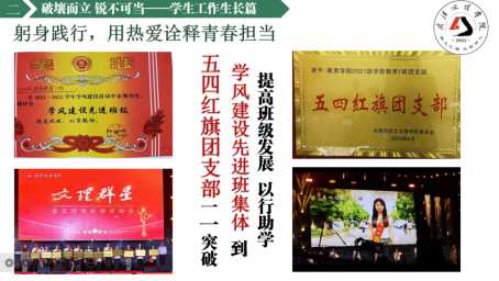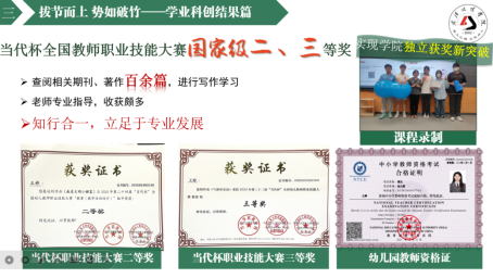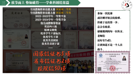 “拔节而上,势如破竹”在专业技能方面,王婷同学积极考取各项证书,获专业级证书5项。她也将所学专业付诸实践,参与教师优秀课题课程录制,在专业老师的指导下,参加当代杯全国教师职业技能大赛,取得全国二等奖的优异成绩。从学识竞赛小白到一次次敢于尝试。坚持理论与实践相结合,在国家级、省级、校院级一共获30余项荣誉。