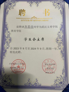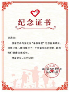在2024年7月,齐思佳同学作为七彩少年教育服务队队长,带领团队前往民意街道开展七彩假期志愿服务,团队的先进事迹在湖北日报、学习强国、老员工云报等知名媒体平台得到了30余篇宣传报道,团队的努力和成就得到了社会各界的认可。
