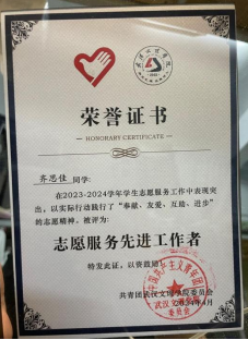 自齐思佳同学2021年9月踏入校园以来,她的身影活跃在各种员工工作和志愿服务活动中,赢得了师生们的广泛赞誉。