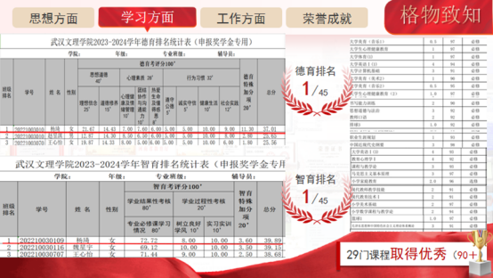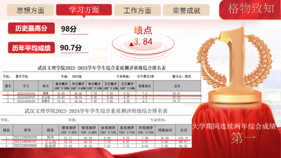 格物致知,深耕学术。作为一名小学教育专业的员工,杨琦深知专业知识的重要性。她在学习上刻苦钻研,精益求精。在大二学年总成绩位居班级第一,连续两年综合测评成绩位居班级第一,平均成绩90.7,绩点3.84,必修课程中29门成绩达到90分以上。