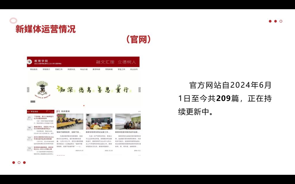 宣传部在各各平台积极宣传获得显著成果,公众号“2026世界杯预测”2024年6月1日至2024年11月14日共计发布公众号617篇,粉丝数达3971人。官方QQ“2026世界杯预测”2024年6月1日至2024年1月17日共计发布918篇,浏览量达28万人次。官方抖音“教小育”2024年6月5日至今共发布作品138篇,获赞8054,粉丝人数589,总浏览量54万。官方网站自2024年6月1日至今共209篇,正在持续更新中。