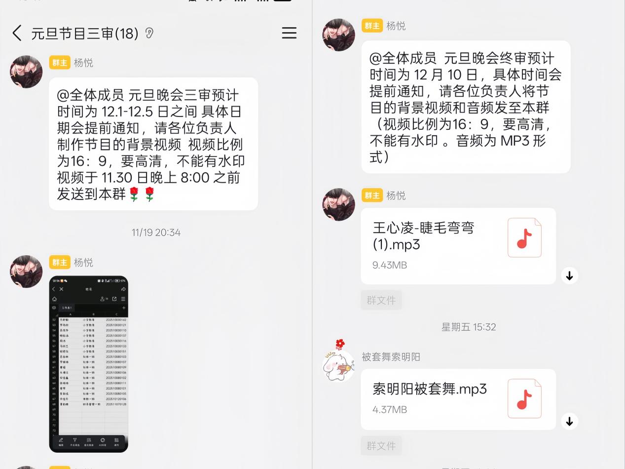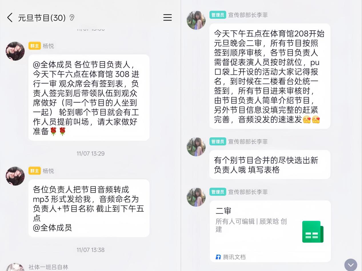 从一审前的群内签到提醒、音频材料收集整理,到二审阶段的节目顺序确认、信息补充完善,再到三审的背景视频规范明确、终审的音视频最终提交,每一轮审核工作的有序推进,均离不开各部门的协同发力与高效配合。其中,文艺部全程统筹调度,提前规划审核流程、精准统筹现场人员衔接,为各环节顺畅开展筑牢基础;宣传部同步推进记录归档工作,部长崔婷、董雅丽牵头完成视频审核,团队成员以镜头定格精彩瞬间、以文字梳理审核动态,同步完成各轮审核的QQ 平台宣传文案撰写,确保宣传工作及时落地;青年发展部积极联动配合,开设 “第二课堂” 共同搭建活动推进工作机制;团学其余各部门主动担当、默默奉献,从场地布置方案研讨到演职人员统筹协调,全方位提供支持保障。各部门凝心聚力、同向发力,切实将 “人人参与、人人尽责” 的工作理念转化为具体行动,为审核工作的圆满推进提供坚实支撑。