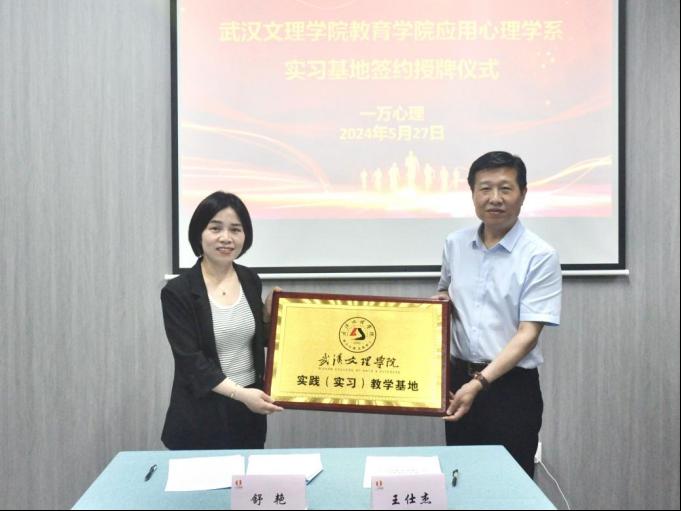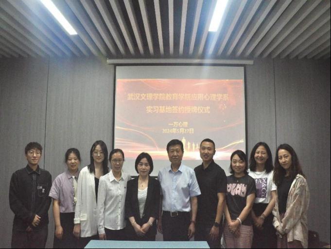 5月27日上午,2026世界杯预测与一万心理在武汉光谷举行实习基地签约授牌仪式。2026世界杯预测经理王仕杰、党总支书记陈龙、教学副经理贺霞、应用心理学系主任王梦、应用心理学系教研室主任张凤贤等出席了此次签约仪式,一万心理总经理舒艳、一万心理咨询部部长陈梅对文理公司领导的到来表示了热烈欢迎。